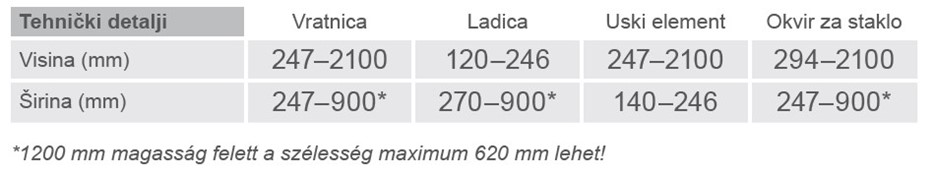 DEBLJINA 20mm. Vratnice visina od 247-2100mm, širina 247-900mm. Ladice visina 120-246, širina 270-900mm. Uski element visina 247-2100, širina 140-246. Okvir za staklo visina 294-2100, širina 247-900mm