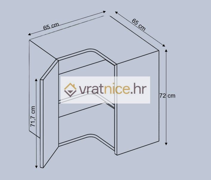 - Kutna GORNJI element H 72 cm kompatibilna je s 2 vrata V 717 x Š 297 mm za vrata od 19 mm i jednim vratima dimenzija 717 x 297 + 717 x 293 za vrata debljine 22 mm